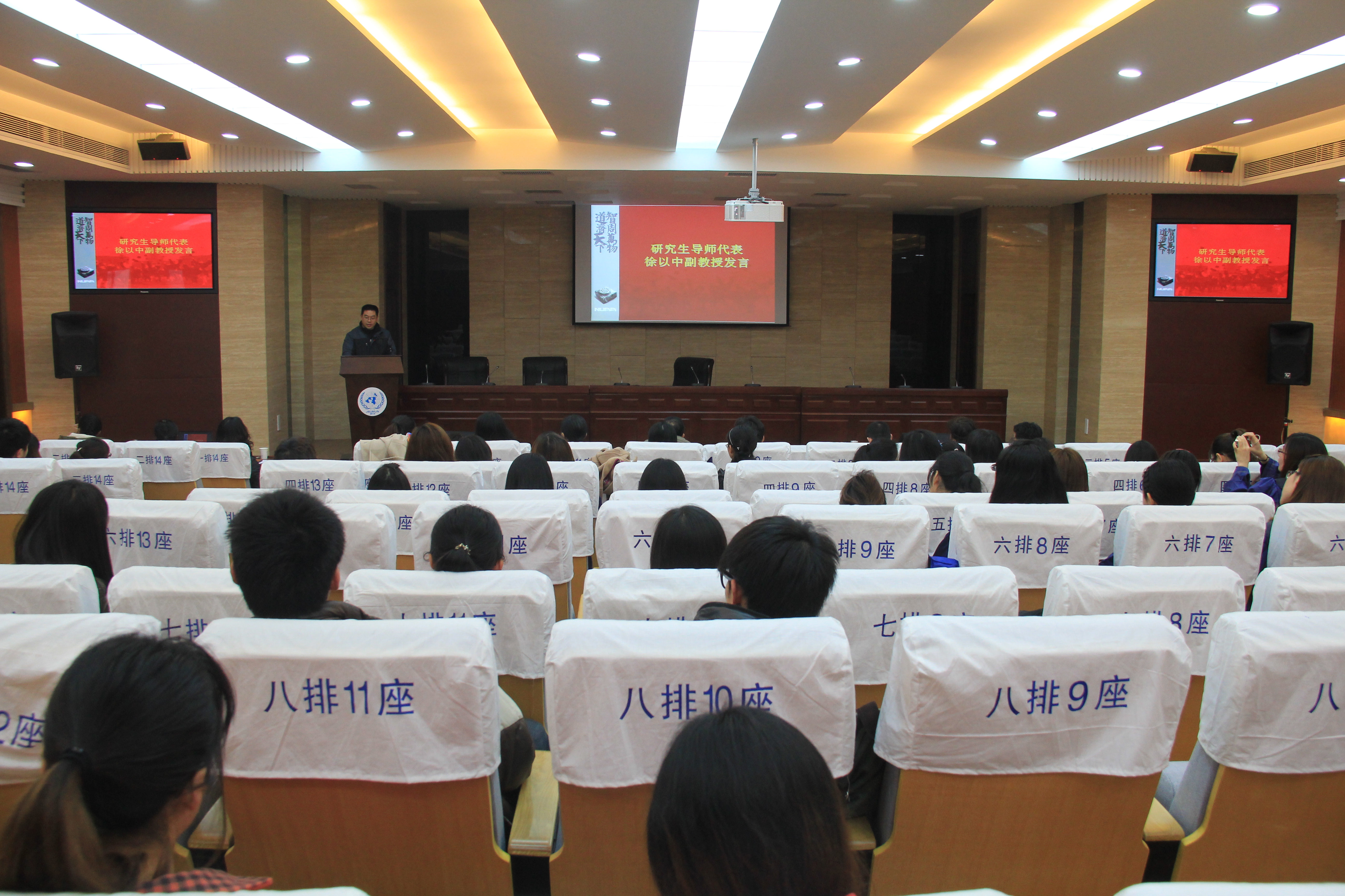 下午14点30分,毕业典礼在雄壮的国歌声中拉开序幕。典礼由刘长江副院长主持,刘健荣书记、研究生代表方颖璐、何江胜院长先后讲话。导师代表徐以中副教授则通过诺贝尔奖获得者莫言作品里的一个小故事,形象生动地向同学们讲述了谦逊、宽容以及培养独立思考能力的重要性,希望南航研究生能培养主动、积极的学习态度,努力成为未来的开拓者。领导和老师们向圆满完成学业,即将奔赴新的学习和工作岗位的各位同学表示热烈祝贺,希望同学们走上社会后,能够不断学习,全面发展,培养创造力和创新精神,同时具有实践精神,志存高远,奋发有为,并鼓励大家立足本职工作,运用自己的学识,发挥聪明才智,谱写精彩人生。