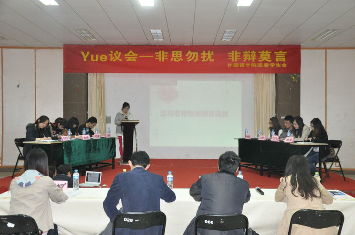 4月1日,外国语学院在将军路校区艺术中心多功能厅举办了学院首届“Yue”议会。学院英语系副主任王孝存老师、学生处事务科科长张跃作为评委参加了此次会议。