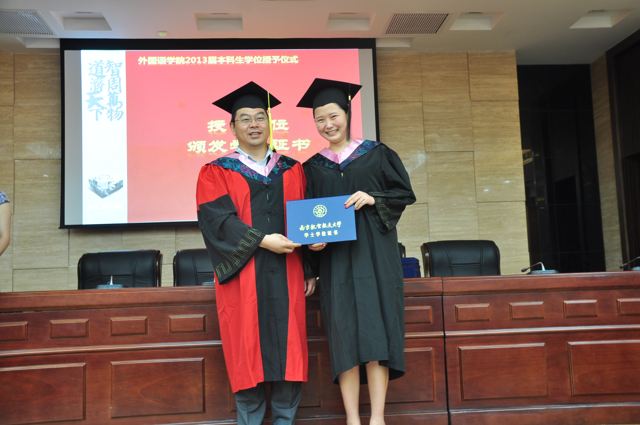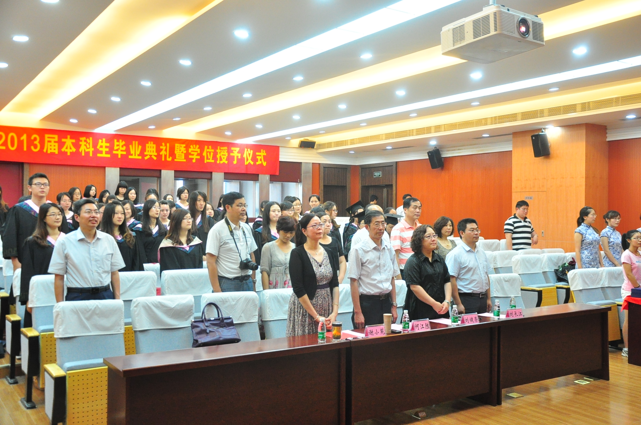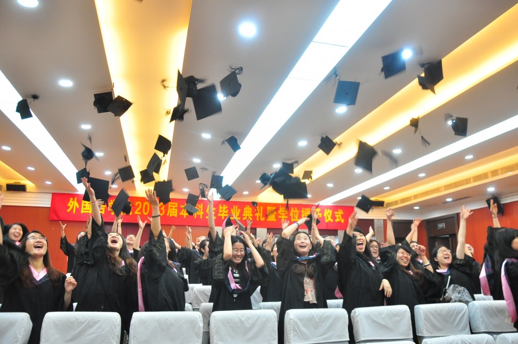 6月21日下午,外国语学院2013届本科生毕业典礼暨学位授予仪式在外国语学院楼举行。院党委书记刘健荣、院长何江胜、副院长谢小苑、刘长江、教师代表、校友代表及家长代表出席了典礼。