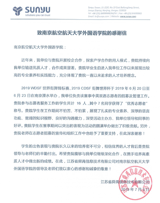 赛事期间,志愿者们“不怕苦、不怕累,展现了扎实的专业素养、深厚的语言功底、宽阔的知识视野、良好的沟通能力”,深受主办方等各界的好评。江苏省舜禹信息技术有限公司表示学生的出色表现与学院长久以来的培养密不可分。为此,该企业特向麻豆社 发来感谢信,感谢学院在志愿者招募工作中给予的重要支持以及多年来在人才培养工作中的努力付出和在校企合作中的积极贡献,希望学院能够与其继续深化合作,在携手培养高素质人才中做出新的成绩。