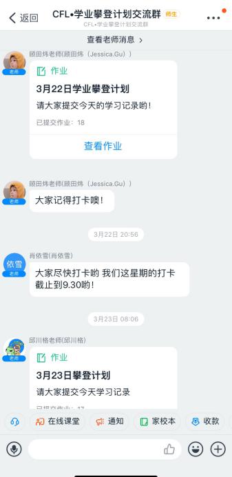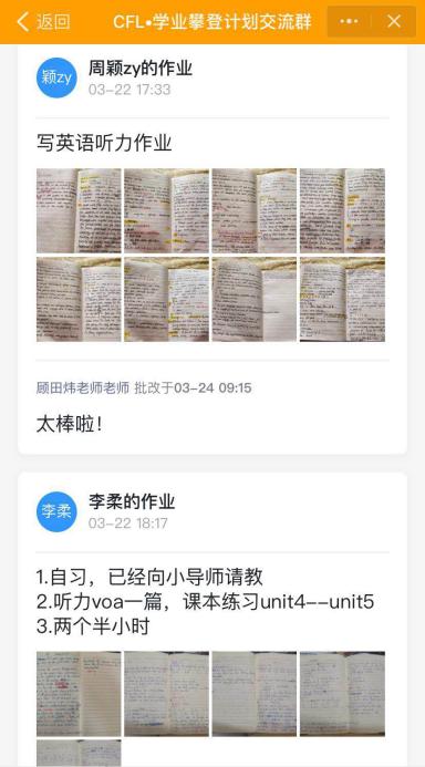 “信守承诺,付诸实践”:按照每周制定的学习计划,学生开始个人学习或线上结对子帮扶学习,每次学习在“CFL·学业攀登计划”钉钉交流群打卡。每周公示所有同学打卡情况,并公布周“打卡之星”,每月展示优秀“个人成长档案”。