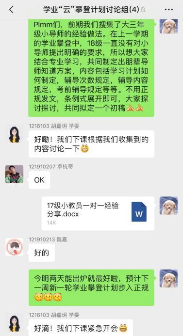 “短期回顾,阶段总结”:辅导员主持召开学业攀登督导会议,进行阶段性总结。邀请学业进步学生及优秀朋辈导师作经验分享,以帮助同学们在下一阶段能更好提升。