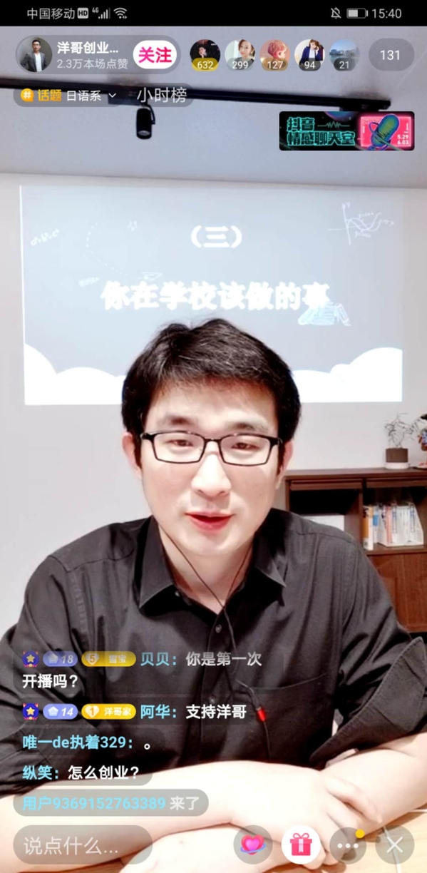 5月31日下午,日语系精品企业课程《科技文化创新创想》第三讲通过抖音平台开启,主讲人为日语系03级刘洋学长,现为谷町君CEO,同时也是南航外国语学院繁星・谷町君奖学金资助者。