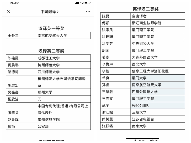 外国语学院高度重视此项赛事,鼓励支持学生积极参与其中。2015-2019年间,学生共获得英译汉二等奖2项,三等奖2项,优秀奖15项,汉译英优秀奖3项。本次汉译英一等奖更是实现了历史性突破。获奖的两位同学表示,成绩的取得离不开学院提供的丰富的实习实践机会,以及专业教师在课堂内外的悉心教导。