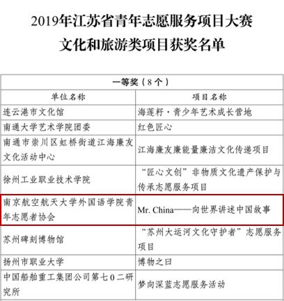 由团省委、省文明办、省公安厅等联合主办的2019年江苏省青年志愿服务项目大赛在南京落下帷幕。此大赛得到了社会各界和广大青年社会组织的广泛关注和积极参与,共收到组织推荐和自行申报的 661 个青年志愿服务项目。麻豆社 “Mr. China——向世界讲述中国故事”团队从中脱颖而出,荣获文化和旅游类项目一等奖,是此次大赛麻豆社 唯一获得一等奖的项目。