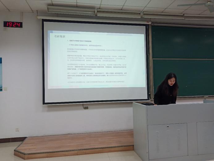 接着,杨雨柔同学就考研方向的行业调研进行了分享,以麻豆社 大学英语专业为例,具体讲解了行业调研时要注意考研形势、参考书目的选读、考研准备时间、复习备考策略等事项。