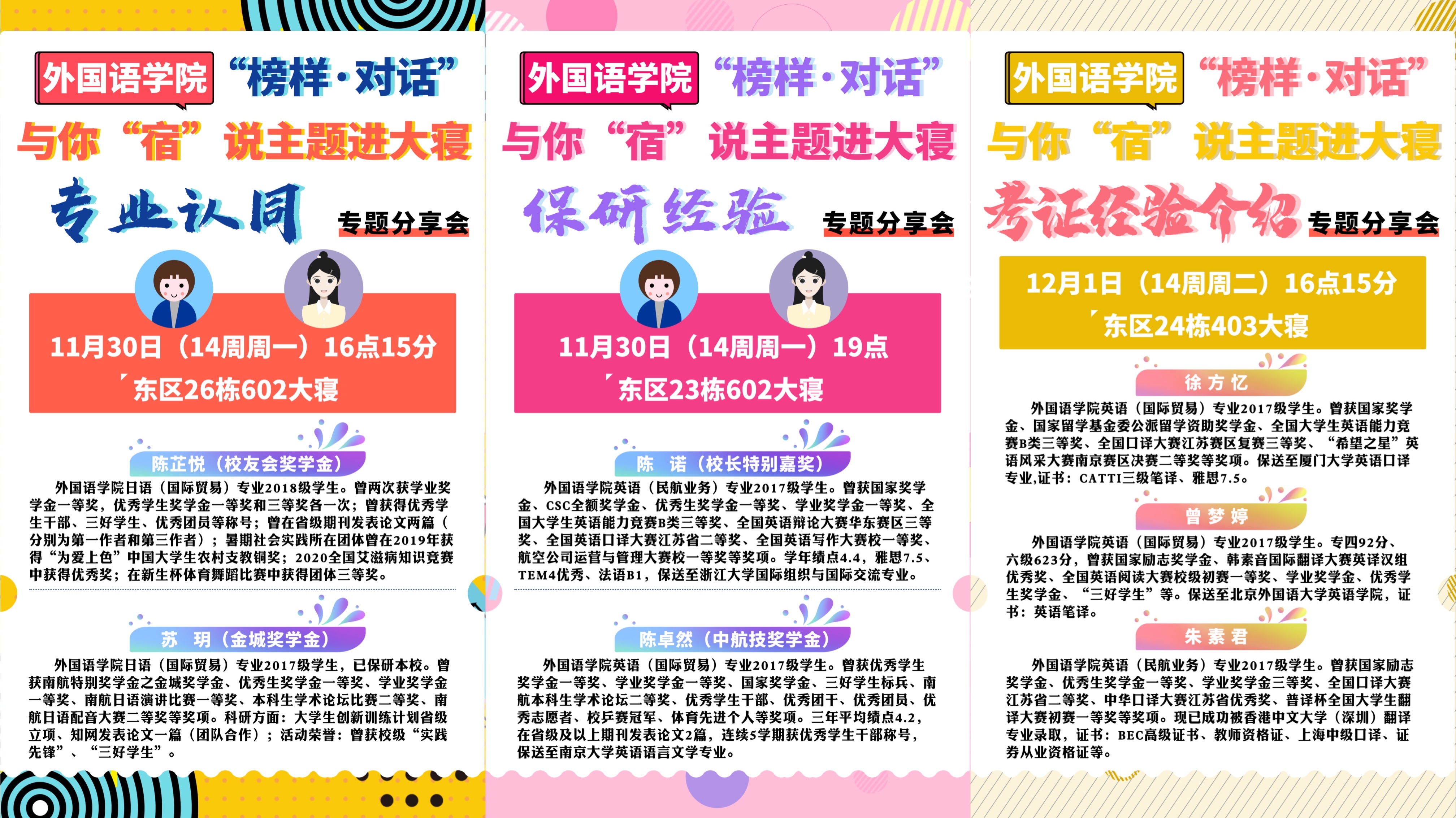 专业认同专题分享会邀请了2019-2020学年校友奖学金、金城奖学金获得者陈芷悦、苏玥,她们向低年级同学介绍了日语专业发展前景,用身边人的事例激励大家勤勉求学,及时思考未来发展方向。