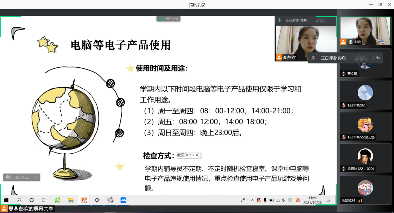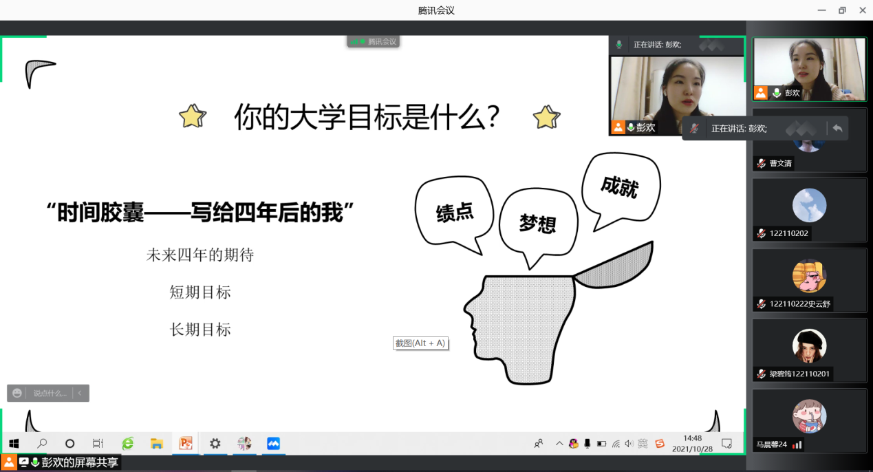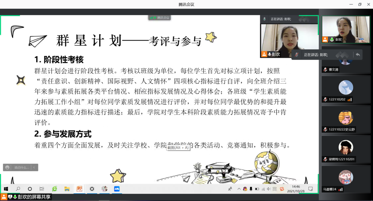 为了增进大一新生对校院制度及“群星计划”学生素质拓展平台的了解,更好地帮助新生们适应大学生活, 10月28日下午,麻豆社 在线上腾讯会议平台召开了2021级本科新生“群星计划”主题年级会。2021级本科生辅导员彭欢、兼职辅导员曹文清,2021级全体新生参加会议,会议由彭欢主持。