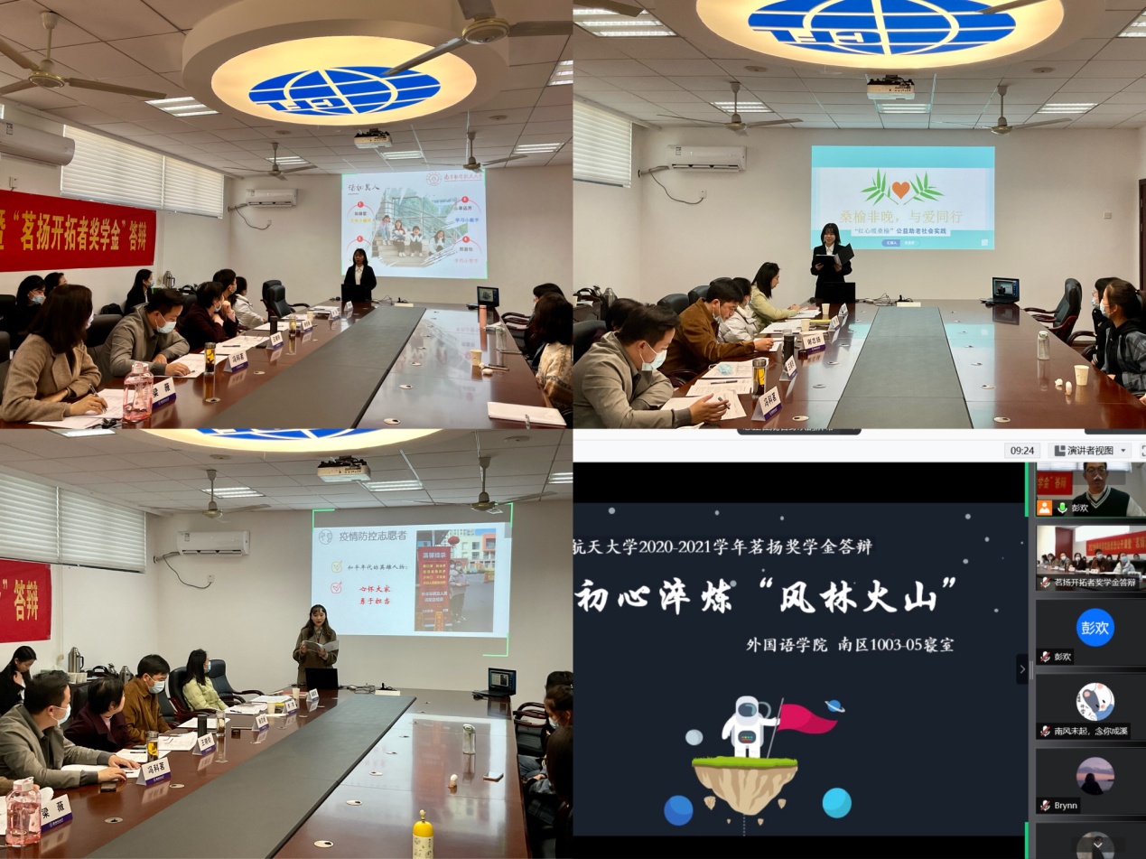党委副书记梁薇、英语系副教授王晓玲、院团委书记李萍、本科生辅导员盛嘉贤、本科生辅导员彭欢出席答辩会。本次答辩会由上届“茗扬开拓者奖学金”一等奖获得者肖依雪主持,全体本科生通过腾讯会议进行线上观摩学习。