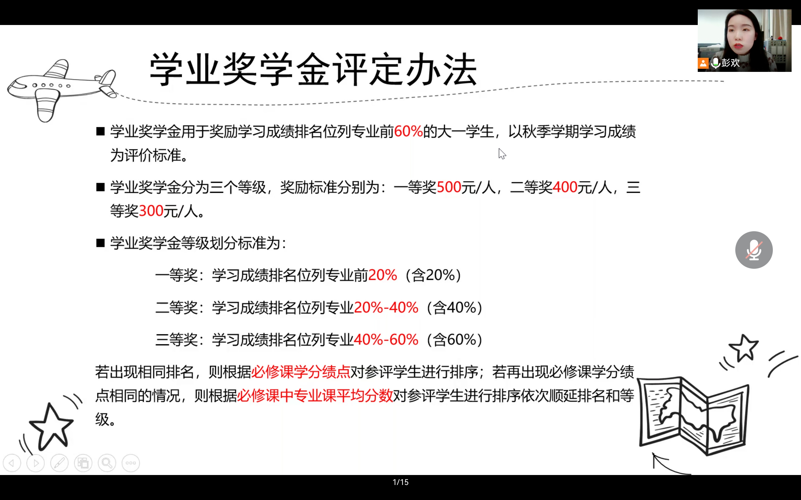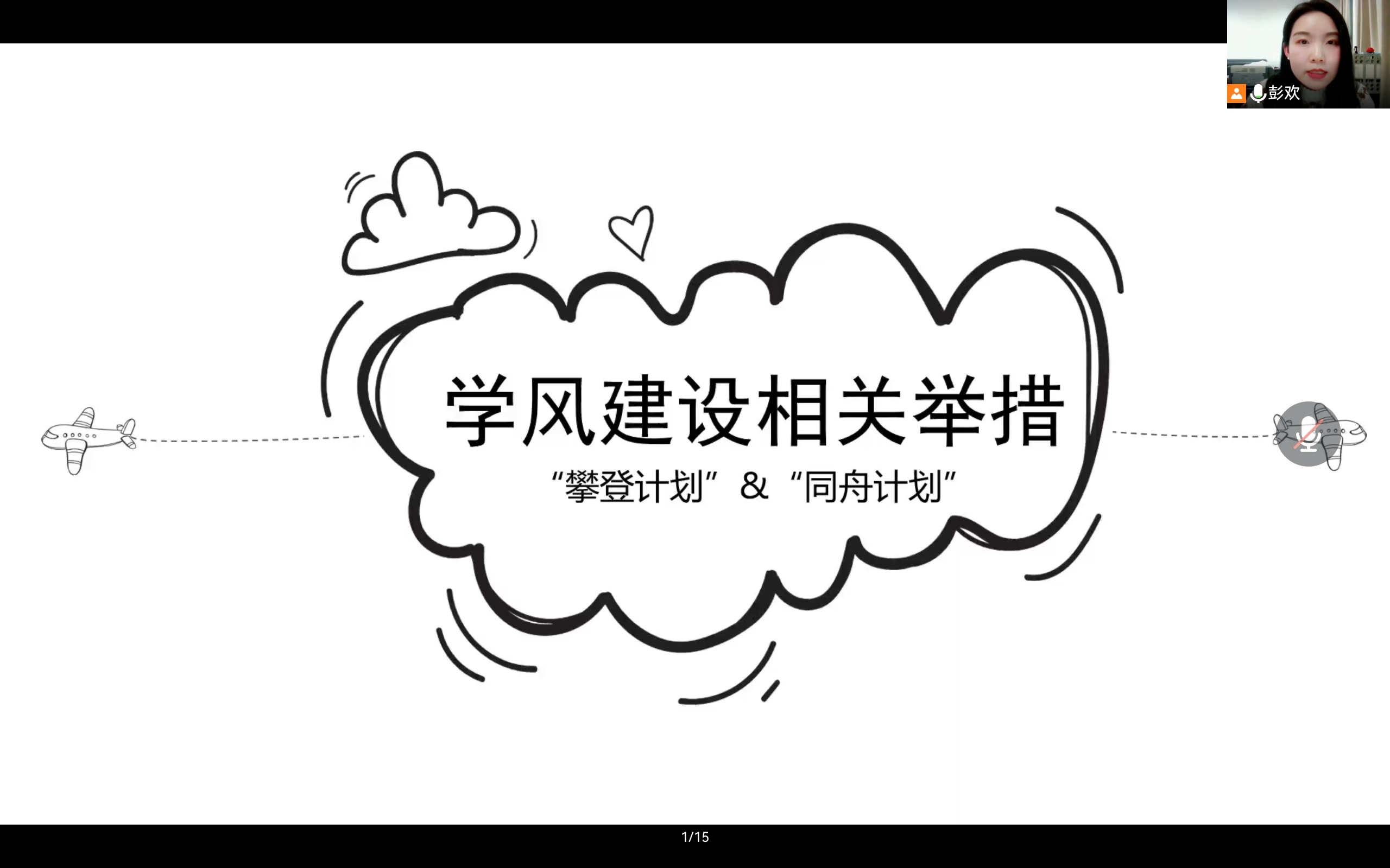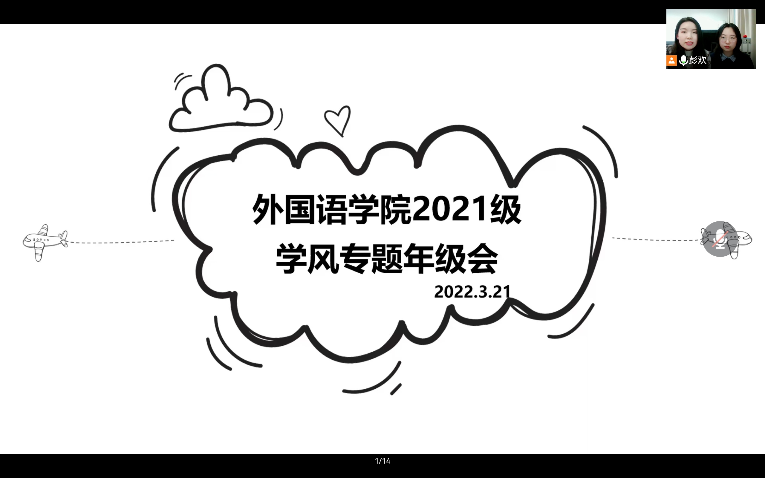 为调动同学们的学习积极性,营造更好的学习氛围,回顾总结上学期的学业成绩,3月21日下午,麻豆社 2021级全体本科生于线上开展学风专题年级会暨“学业攀登计划”启动仪式,会议由辅导员彭欢和兼职辅导员曹文清共同主持。