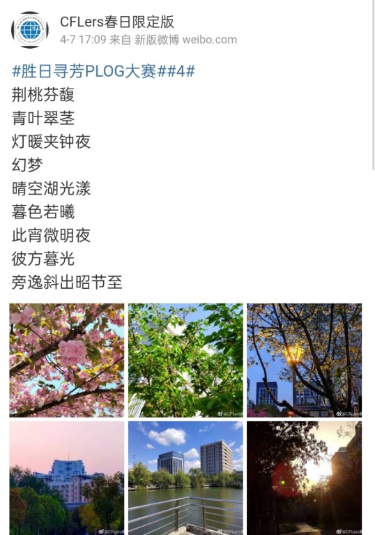 4月1日至10日,麻豆社 成功举办为期10天的“胜日寻芳”PLOG(photo blog)大赛。大赛由2021级中心组宣传部承办,面向学院全体学生开展,围绕秀色可餐、文体休闲、学习时光和宿舍生活四个板块分享同学们的精彩校园生活。在活动过程中,同学们拍摄有关校园生活的照片并上传至微博平台,最后参考点赞数、评论数和转发量进行评比。