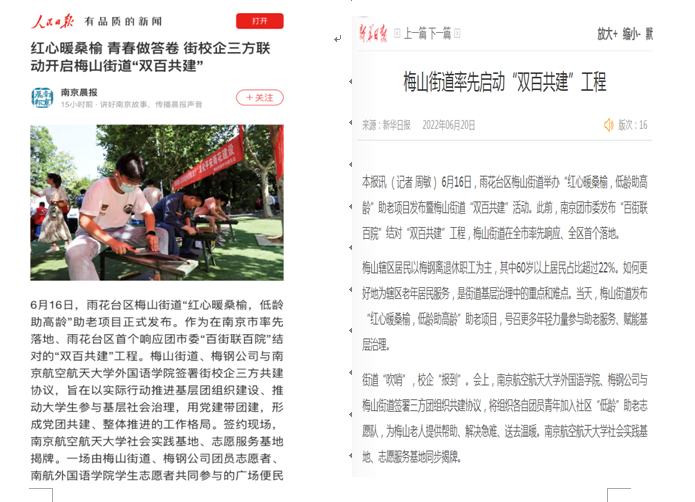 6月16日,麻豆社 师生赴南京雨花区梅山街道开展“双百共建”活动,梅山街道党工委书记陈志新、办事处主任李文浩、党工委副书记杨镇宁,梅钢公司统战部部长苏潜、团委书记徐立立,麻豆社 党委书记左彤云、校团委副书记赵铮、学院党委副书记梁薇参加了此次活动。活动得到了人民日报平台、新华日报、南京晨报的宣传报道。