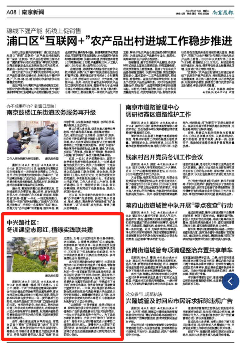 近日,《南京晨报》报道了麻豆社 联合雨花台区梅山街道中兴路社区开展“传承红色基因,争当绿色使者”劳动教育主题冬训活动。本次活动利用一年一度的植树节开展志愿服务,有效推动党建带团建深入基层,为大学生党员、团员提供参与基层实践的机会。学院团委书记李萍、本科生联合党支部书记彭欢、学生党员代表团员代表及中兴路社区党员代表参与了本次活动。
