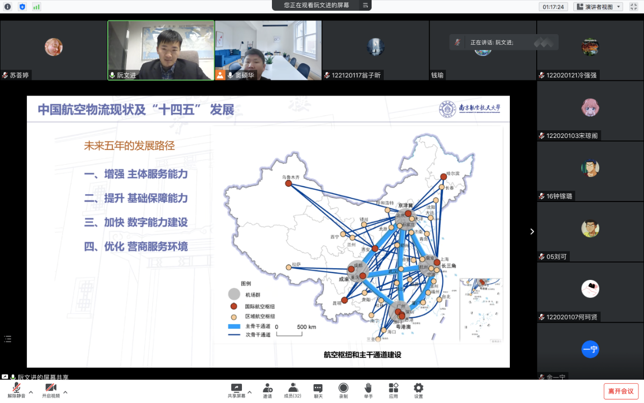 3月11日上午10:00,外国语学院日语系中日航空科技文化课程“志在蓝天,航空报国”2023年度第一讲通过腾讯会议成功举办,主题为《中日美航空物流的现状与发展趋势》,主讲嘉宾为03级日语系校友阮文进,曾任东方航空公司日本区域经理,现任中国货运航空公司北美地区营销中心区域经理。