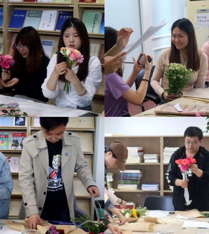 破冰活动后,雷若岚介绍了不同种类鲜花的名称和种类,从花材选择、风格搭配和鲜花包装等方面进行了具体讲解,为同学们推荐了操作性极强的包装教程。在轻松愉悦地氛围中,同学们尽情地发挥自己的创意,巧妙构思、悉心修剪,鲜花被赋予了新的生命。在满室芬芳和欢声笑语中,一束束精美别致、鲜活艳丽的插花作品跃然眼前。