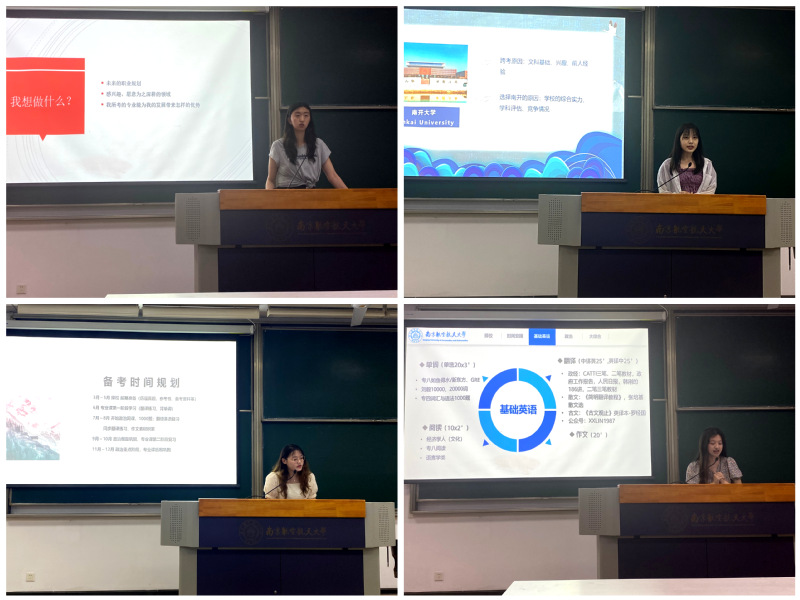 活动开始,大三年级中心组成员朱芸与田欣如同学介绍了四位同学被录取的院校情况。之后,2022年麻豆社 英语笔译方向初试第二名的凌晨妍同学分享了MTI考研经验。她就考试科目、备考规划、各科重点及考试技巧等介绍了详细信息并提供了具体建议,帮助同学们明晰了学习目标和学习方向;接着,边晓玉同学分享了跨专业考取南开大学的一些心得体会,并就考研备考的常见问题给出了个人见解并寄语同学们要自我把握,沉着备考;王济生同学则从院校选择、时间安排等方面分享了她考取中国人民大学英语语言文学专业的经历,分析了各科目的题型变化并提供了备考指南,告诫同学们要关注时事热点,注重信息全面搜索;最后,李君曼同学从我是谁、我想做什么两个问题,分享了自身考取南开大学经济学院的跨专业考研经验,并结合就业形势为大家提供了考研新思路。