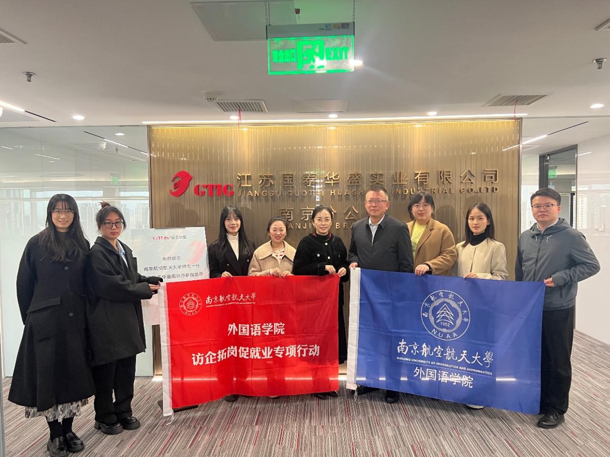 为落实教育部和江苏省教育厅“访企拓岗促就业”专项行动要求,搭建校企交流合作平台,进一步拓宽毕业生就业渠道,促进毕业生更高质量、更充分的就业,11月24日,外国语学院赴江苏国泰华盛实业有限公司走访调研。学院党委副书记吴科颖带队,学院团委书记兼研究生辅导员李萍、本科生毕业班辅导员赵瑜瑶以及本硕两名学生代表参加调研活动。江苏国泰华盛实业有限公司人力资源部主任顾华锋、人力资源部主任助理胡恺雯、盛悦分公司业务经理侯长青以及人力资源部招聘专员杨杰共同参加座谈交流。