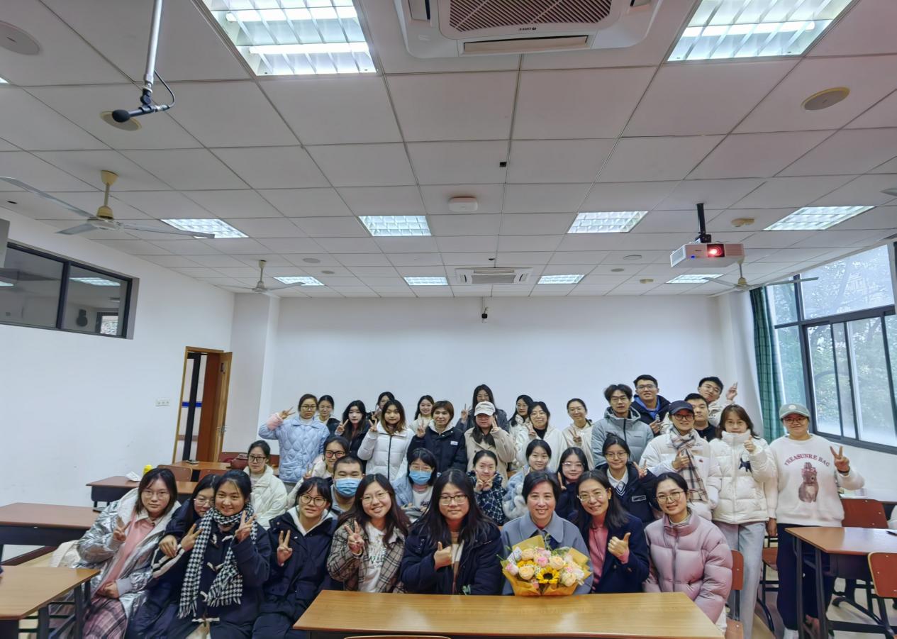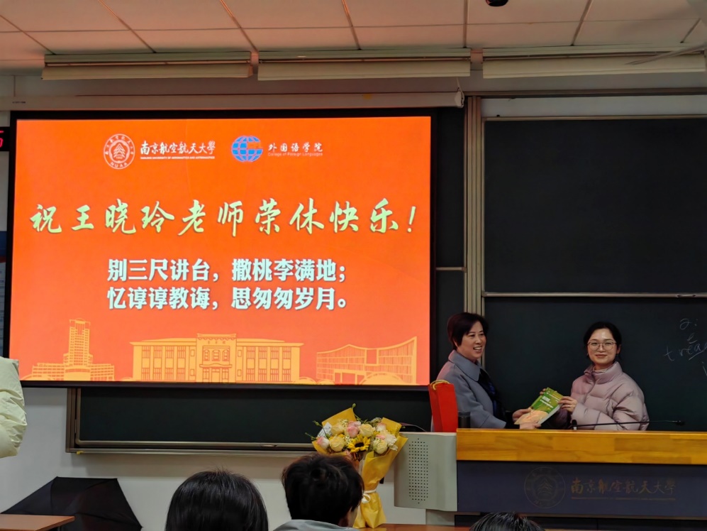此外,开拓者奖助学金中有一项特别的奖学金,为“王晓玲老师特别奖”。今天也正值王晓玲老师执教生涯最后一课。临别之际,学院教师代表及大二英语系的同学们共同为王晓玲老师举办了荣休仪式。别三尺讲台,撒桃李遍地,在36年执教生涯的最后,王晓玲老师表达了对英语专业教学的热忱、对英语学科发展的关注、对外国语学院的不舍。“Be more prosperous in your study and career!”道出了王老师对莘莘学子们的美好祝愿与殷切期望。