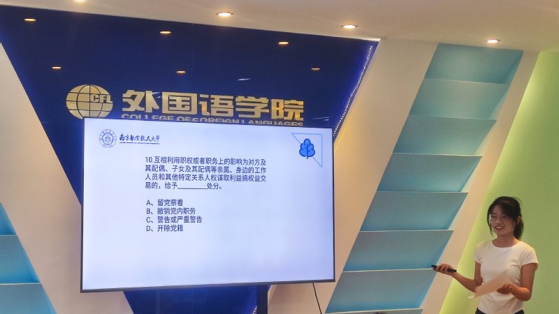 为进一步深入贯彻落实习近平总书记关于党纪学习教育的重要讲话和指示批示精神,5月10日,外国语学院联合航空学院举办学习《中国共产党纪律处分条例》知识竞赛,外国语学院团委书记李萍,航空学院辅导员丛歆雨,外国语学院辅导员彭欢、姚灵珑,以及双方学院学生党员代表参加了此次活动。活动由外国语学院学生支部书记丘彩珍主持。