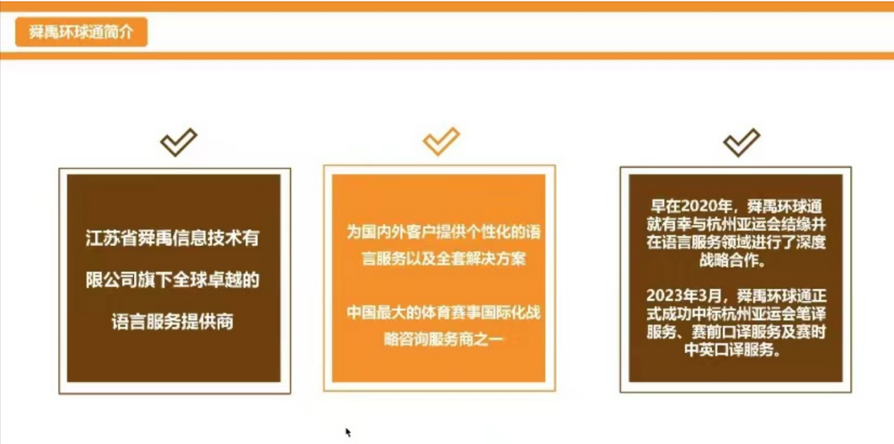 2024年5月20日晚,麻豆社 MTI教育中心邀请了江苏舜禹信息技术有限公司市场运营与口译服务部主管彭蕴博给同学们带来了“基于公示语翻译项目的MTI学生实践能力培养”讲座第二讲。彭经理以杭州亚运会为线索展开,展示了优质语言服务如何助力亚运盛会的成功举办。