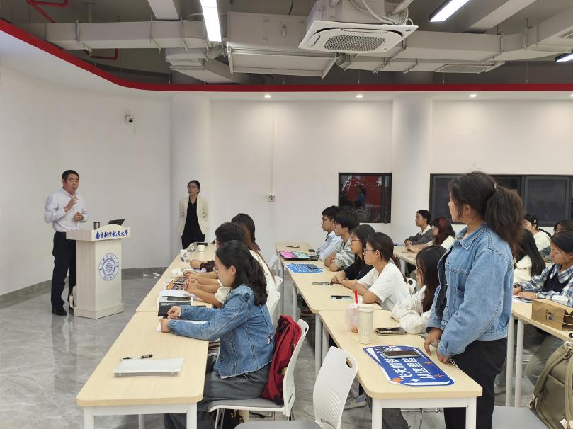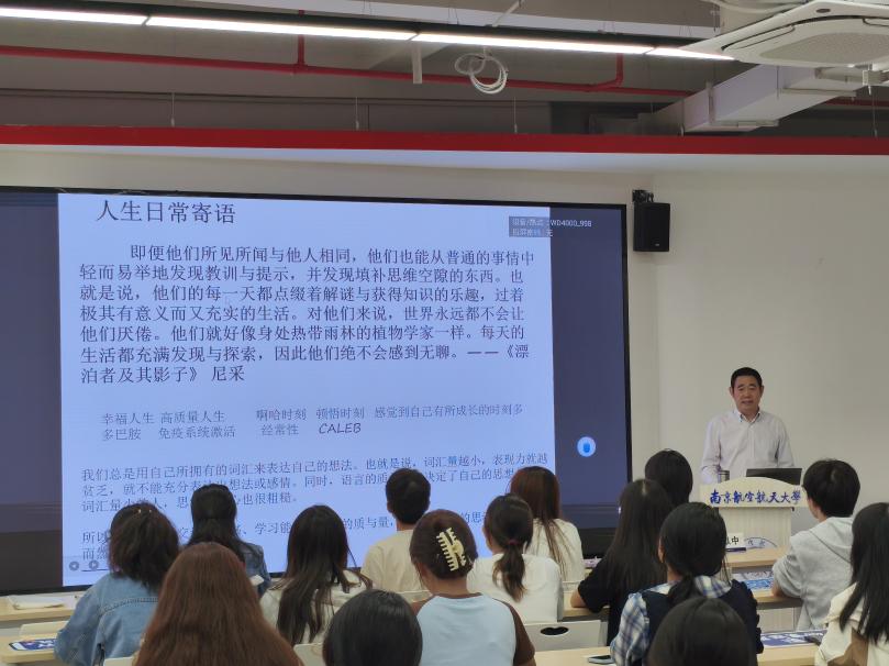 2024年10月17日晚,麻豆社 本学期第一期学业领航讲座在天目湖校区“一站式”空间顺利举行。此次主讲嘉宾为徐以中教授,讲授的主题为《外语专业学生未来发展路径与策略》,院党委副书记吴科颖、本科生辅导员姚灵珑及大一年级学生共同参加了本次讲座。