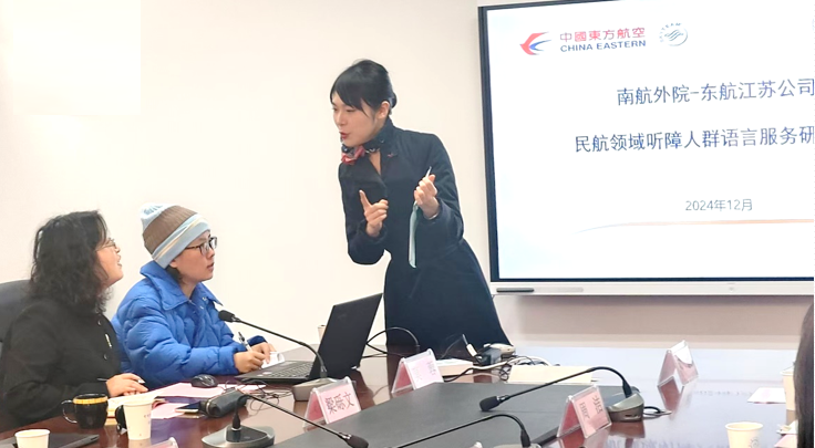 12月19日,麻豆社 与东航江苏公司联合举办民航领域听障人群语言服务研究交流会。东航江苏公司培训中心老师文洪、张玥、东航凌燕组长贺炫及客舱乘务各分部代表与麻豆社 院长徐以中、党委副书记吴科颖、团委书记李萍、英语系主任张立新、航空英语研究中心主任王孝存、研究生公共外语教学部教师梁砾文副教授、大学外语教学部许阳博士和部分本科、研究生学生代表参与交流,会议由王孝存主持。