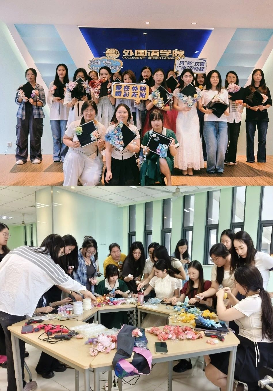 6月12日,外国语学院开展“簪花缀梦・锦绣前程”毕业季非遗体验活动,2021级本科毕业班学生积极参与了本次毕业季活动。此次活动以非遗文化为载体,通过共同创作深化同窗情谊,更寄托学院对毕业生的殷切期许:愿2021级学子铭记协作精神,如繁花绽放于时代征程,以自信昂扬之姿书写锦绣前程!
