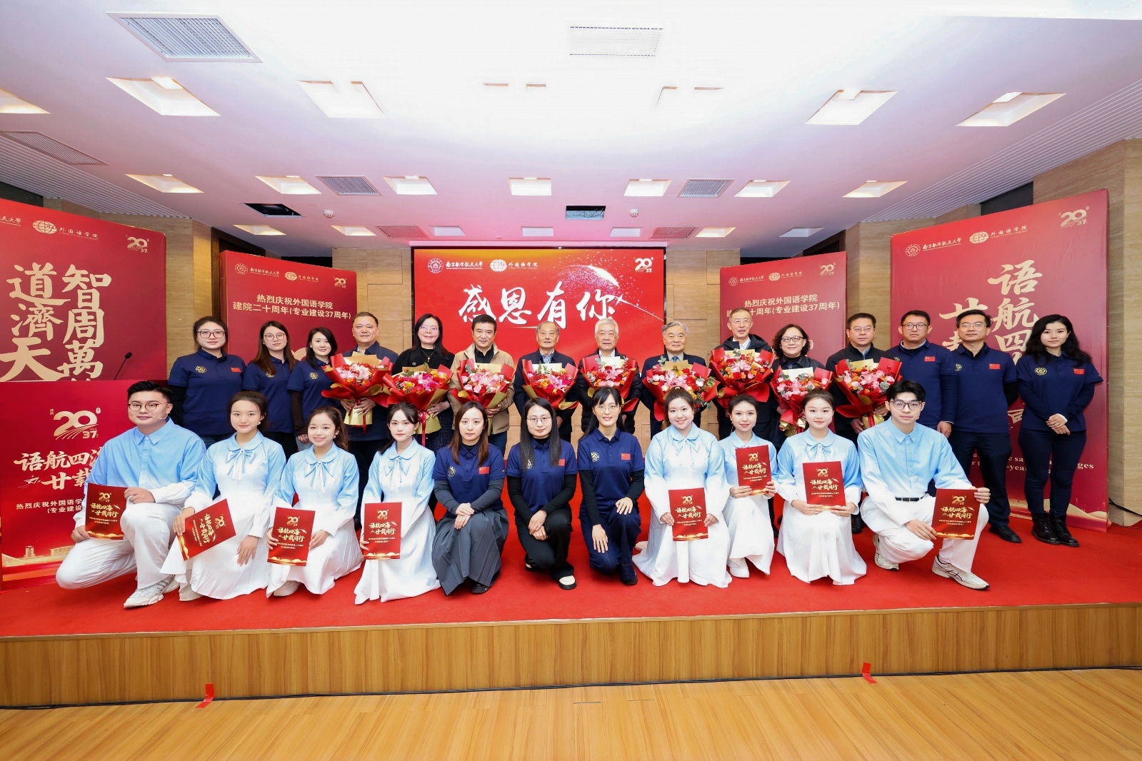 南京航空航天大学校长助理潘时龙教授,外国语学院历任院领导,曾在外国语学院学习或工作过的领导、兄弟学院领导、院友代表、学院教职工及学生代表出席大会。全球校友、广大师生、社会各界朋友通过网络平台观看大会直播,共同庆祝学院建院二十周年。