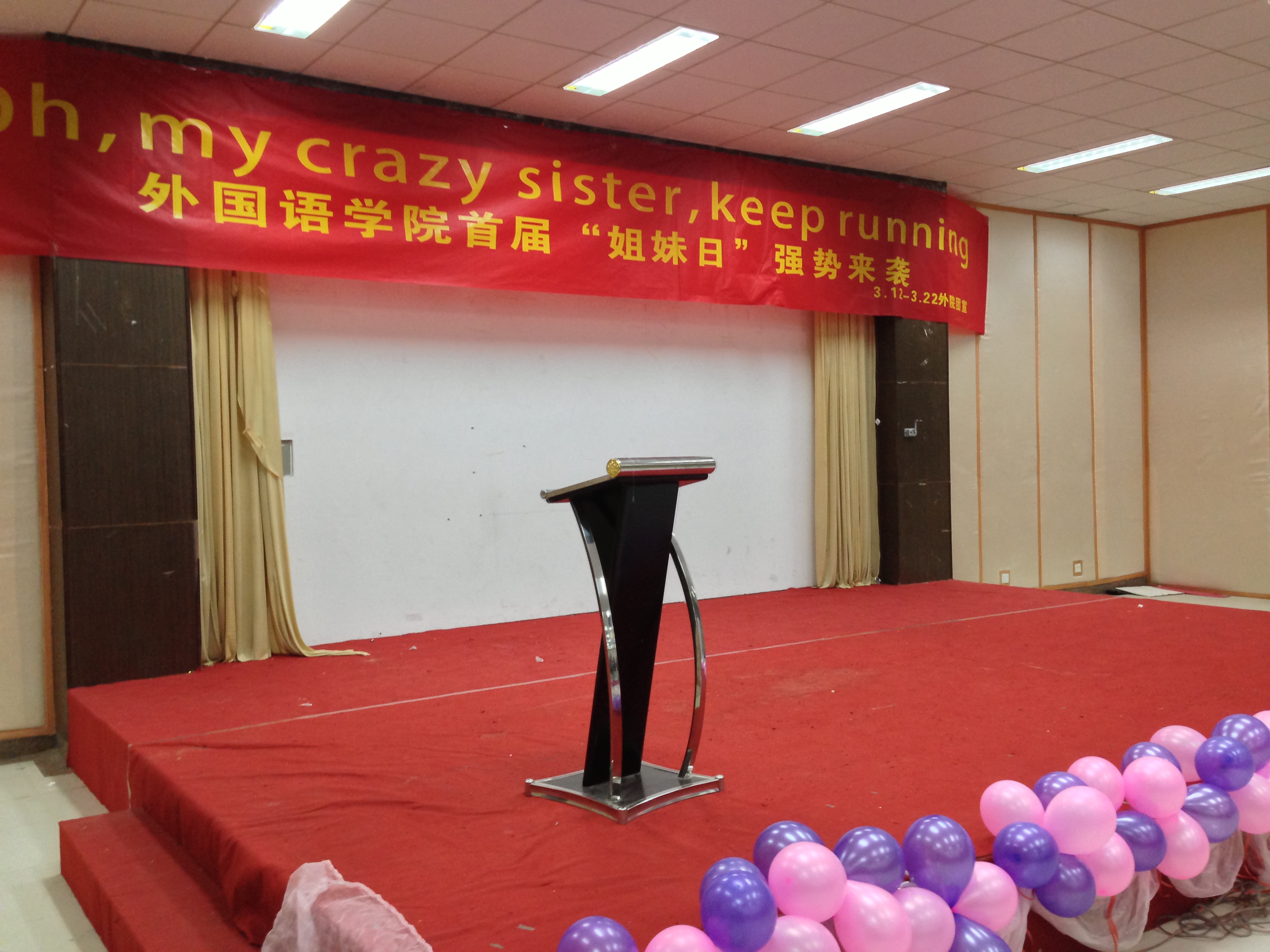 外国语学院首届“姐妹日”活动于2013年3月21日至22日在将军路校区艺术中心多功能厅举行。来自外院的近百名女生组成“姐妹”组合参与了此次活动。