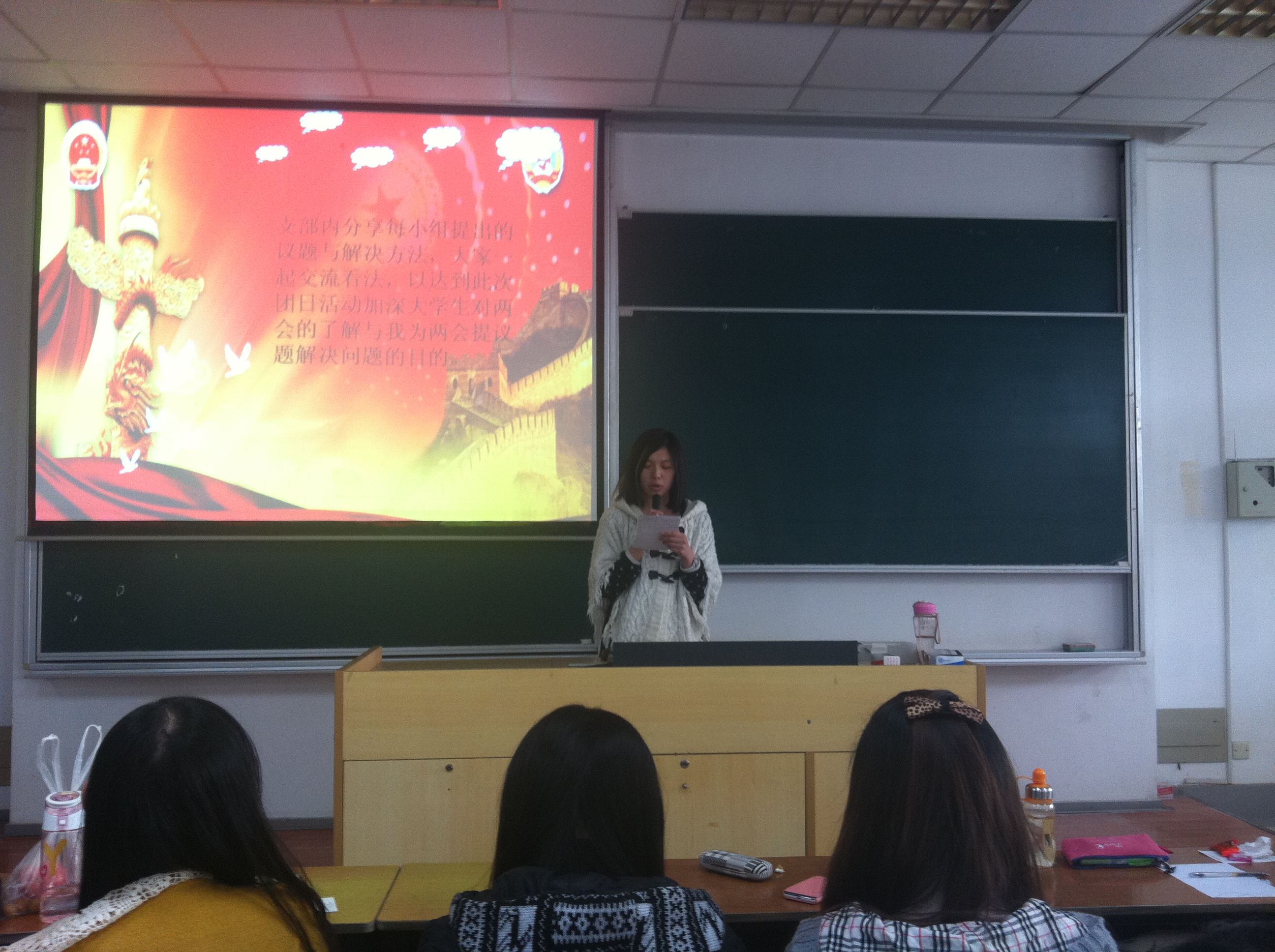 全国政协十二届一次会议和全国人大十二届一次会议于2013年3月在北京胜利召开,为深入学习“两会”精神,引导学生关心、关注国家大事,加强学生历史使命感和社会责任感,启发学生独立思考,积极实践,外国语学院11级本科生团总支采取多种形式,灵活安排时间,积极组织学生探讨“两会”内容,学习“两会”精神。