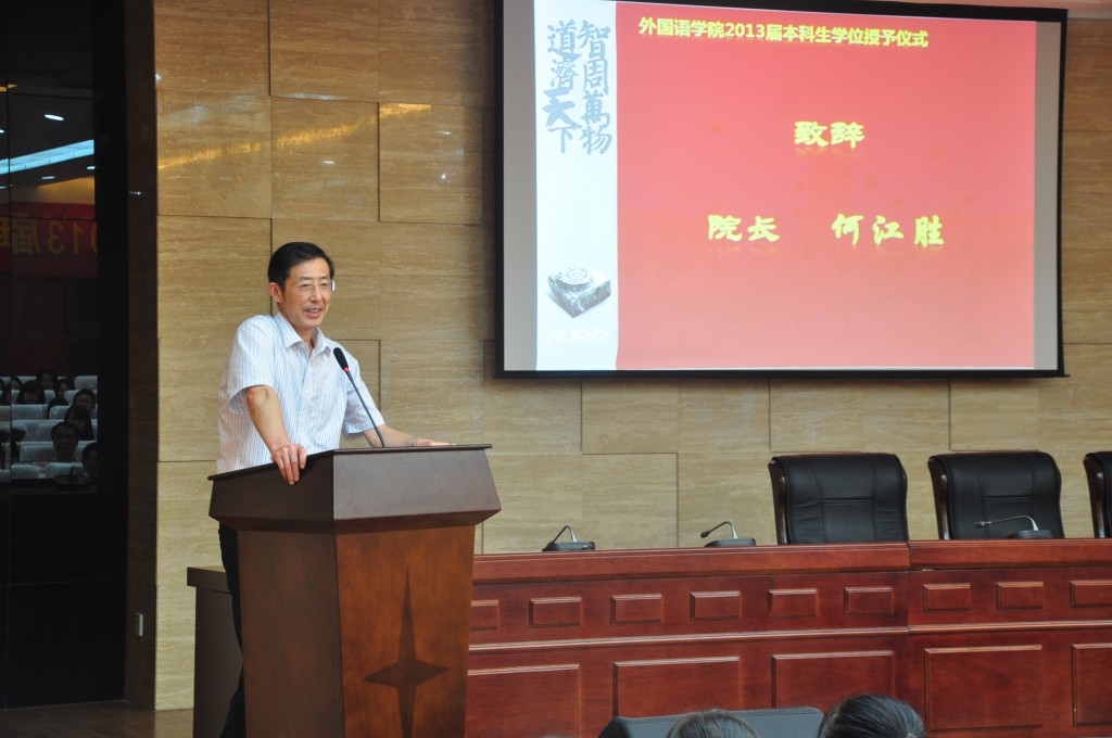 6月21日下午,外国语学院2013届本科生毕业典礼暨学位授予仪式在外国语学院楼举行。院党委书记刘健荣、院长何江胜、副院长谢小苑、刘长江、教师代表、校友代表及家长代表出席了典礼。