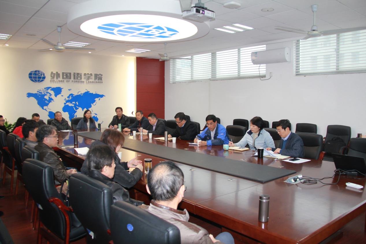 11月27日,外国语学院召开题为“提升质量 强化特色:研究生教育高质量发展”座谈会。外国语学院院长范祥涛,党委书记左彤云,副院长徐以中以及硕士生导师参加会议,学院督导组专家谢小苑、何江胜、石云龙教授出席,座谈由副院长姜礼福主持。会议还特别邀请了校纪委委员、国际教育学院院长、全省抗击新冠肺炎疫情先进个人金泉元莅临指导。