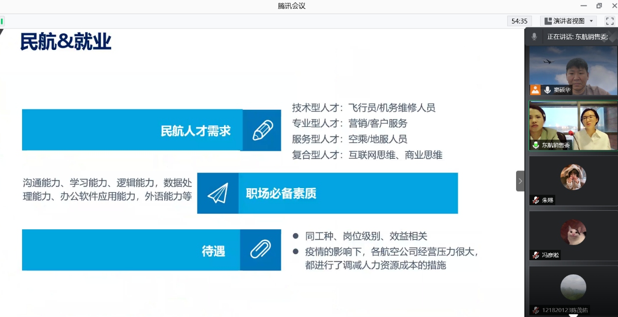 5月17日晚18点,外国语学院日语系《科技文化创新创想》第六讲通过腾讯会议开启,主题为《梦想起航——高校教育助力我们在航司成长》,主讲人为东航销售委的许竹欣和程子原两位优秀代表,其中许竹欣为南航06级校友。