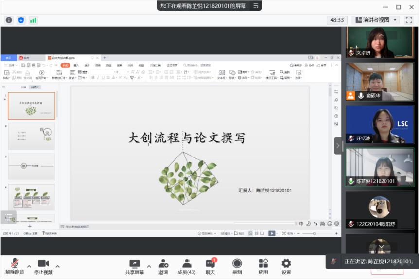 陈芷悦同学以完成的三篇论文为例,介绍了大创的申报流程、研究方法、论文攥写步骤、投稿注意事项,面面俱到、重点突出、切中问题要害,满满的干货让同学们耳目一新,受益匪浅。