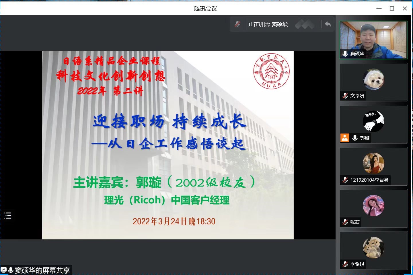 3月24日下午6:30,外国语学院日语系科技文化创新创想课程2022年度第二讲通过腾讯会议成功进行,主题为《迎接职场,持续成长——从日企工作感悟谈起》。主讲嘉宾为日语系02级校友郭璇,现任理光(Ricoh)中国客户经理。