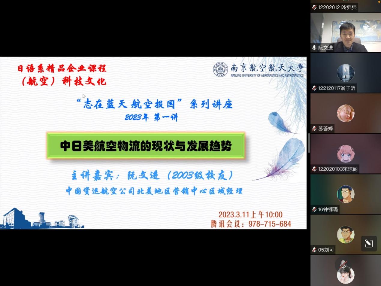 3月11日上午10:00,外国语学院日语系中日航空科技文化课程“志在蓝天,航空报国”2023年度第一讲通过腾讯会议成功举办,主题为《中日美航空物流的现状与发展趋势》,主讲嘉宾为03级日语系校友阮文进,曾任东方航空公司日本区域经理,现任中国货运航空公司北美地区营销中心区域经理。