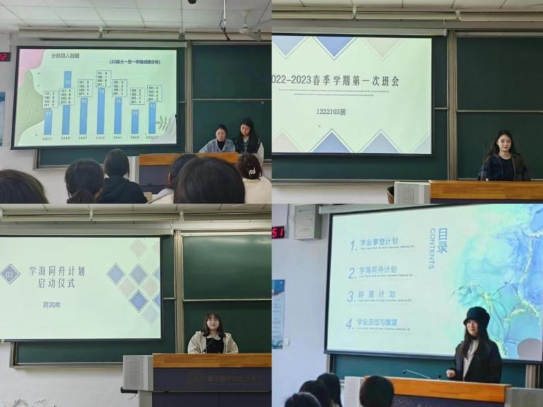 班长王雨露、叶羽桐、李媛婷首先对班级上学期的期末成绩进行了分析总结,列出同学们需要加强的板块,对单词积累、阅读、听力等薄弱环节提出了解决方案,并提议借助“班级学海同舟计划”,利用辩论会、圆桌会议、配音秀、日语歌曲学习等形式多样的趣味活动,激发同学们学习的积极性和主动性,共创勤学、善思、笃学的班级氛围。同学们纷纷响应号召,积极踊跃地对班级建设和未来规划提出了自己的见解和想法,讨论氛围热烈。