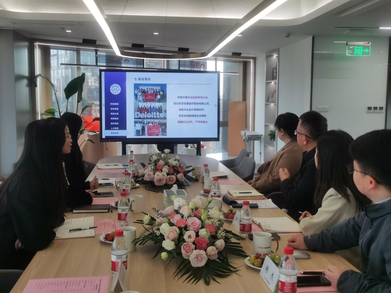 为落实教育部和江苏省教育厅“访企拓岗促就业”专项行动要求,搭建校企交流合作平台,进一步拓宽毕业生就业渠道,促进毕业生更高质量、更充分的就业,11月24日,外国语学院赴江苏国泰华盛实业有限公司走访调研。学院党委副书记吴科颖带队,学院团委书记兼研究生辅导员李萍、本科生毕业班辅导员赵瑜瑶以及本硕两名学生代表参加调研活动。江苏国泰华盛实业有限公司人力资源部主任顾华锋、人力资源部主任助理胡恺雯、盛悦分公司业务经理侯长青以及人力资源部招聘专员杨杰共同参加座谈交流。