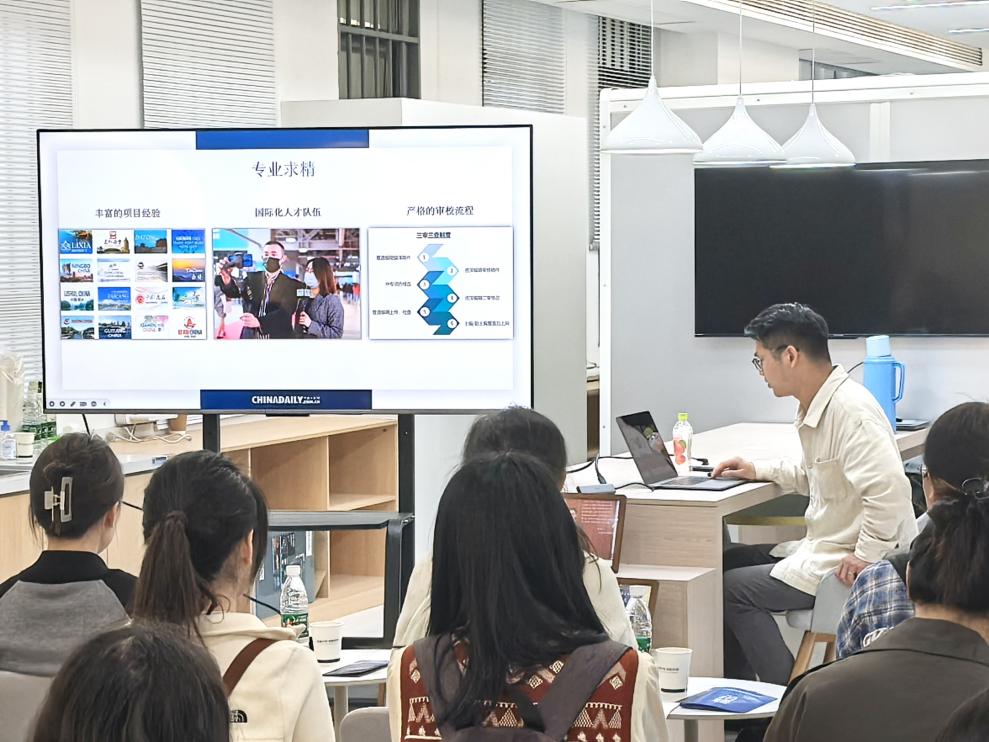 活动伊始,吴科颖致开场词,对中国日报网无锡公司的到来表示诚挚的欢迎。她简要介绍了麻豆社 的办学特色与学科优势,同时向学生们阐述了中国日报网在新闻传播领域的卓越影响力及其行业内的领先地位。她指出,长期以来,学院学生一直将CHINADAILY作为重要的学习平台,在英语学习、国际视野拓展以及跨文化交流等方面受益匪浅。她希望同学们能够珍惜此次难得的交流机会,积极与企业代表互动,汲取更多宝贵经验。