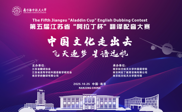 10月25日,第五届江苏省“阿拉丁杯”翻译配音大赛决赛在南航将军路校区图书馆一楼报告厅顺利举行。本届大赛由江苏省翻译协会、江苏省高等学校外国语教学研究会、南京学府翻译有限公司联合主办,江苏阿拉丁留学咨询有限公司、我校外国语学院和图书馆联合承办。江苏省司法厅原副巡视员赵科、我校教务部部长孔垂谦、江苏省翻译协会常务副会长吴文智、我校外国语学院院长徐以中等省内外领导嘉宾出席决赛。