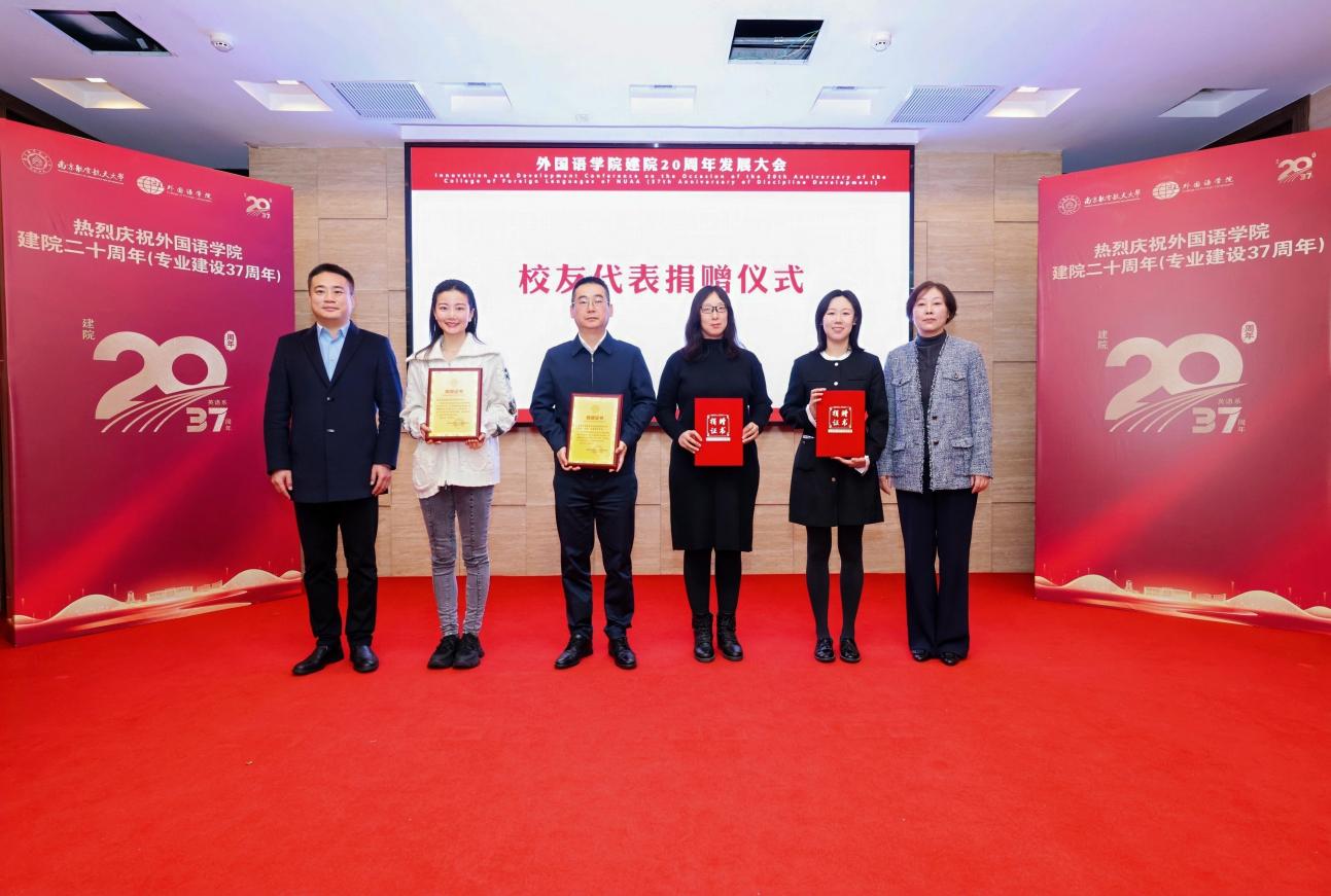 长期以来,校友们不仅在事业上成绩卓著,更通过设立奖学金、开展合作项目、提供实习就业机会等方式,持续支持学院发展。此次大会部分校友代表也带来了他们对学院的心意,南航校友总会秘书长、教育发展基金会秘书长李和新、外国语学院党委书记左彤云上台接受捐赠。